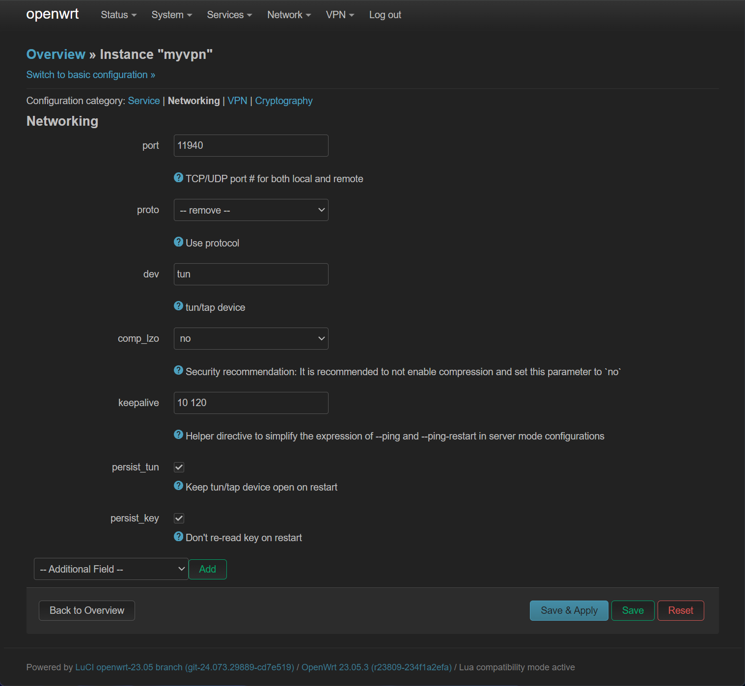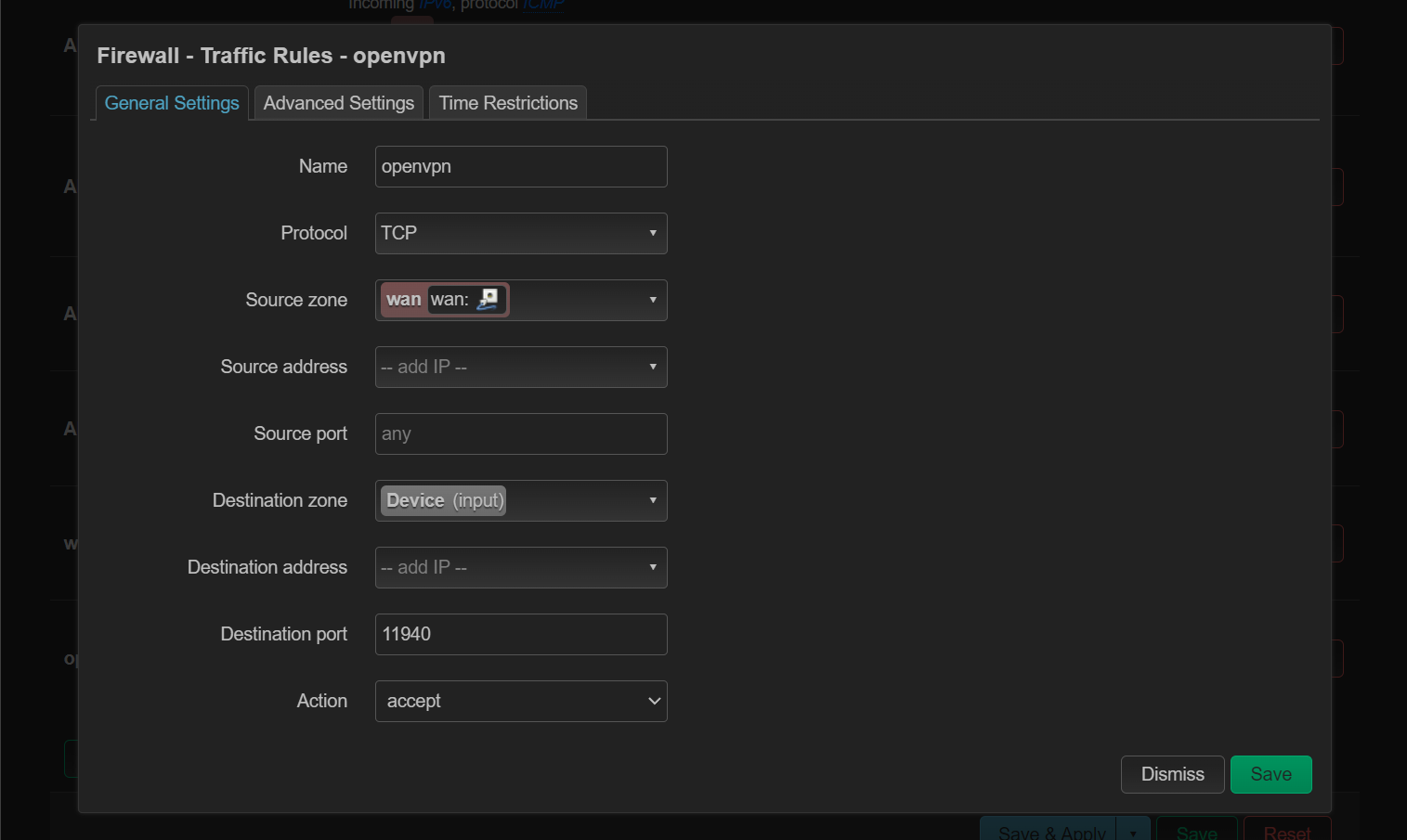 在 Network -> Firewall -> Traffic Rules 配置防火墙,放行 OpenVPN 端口: