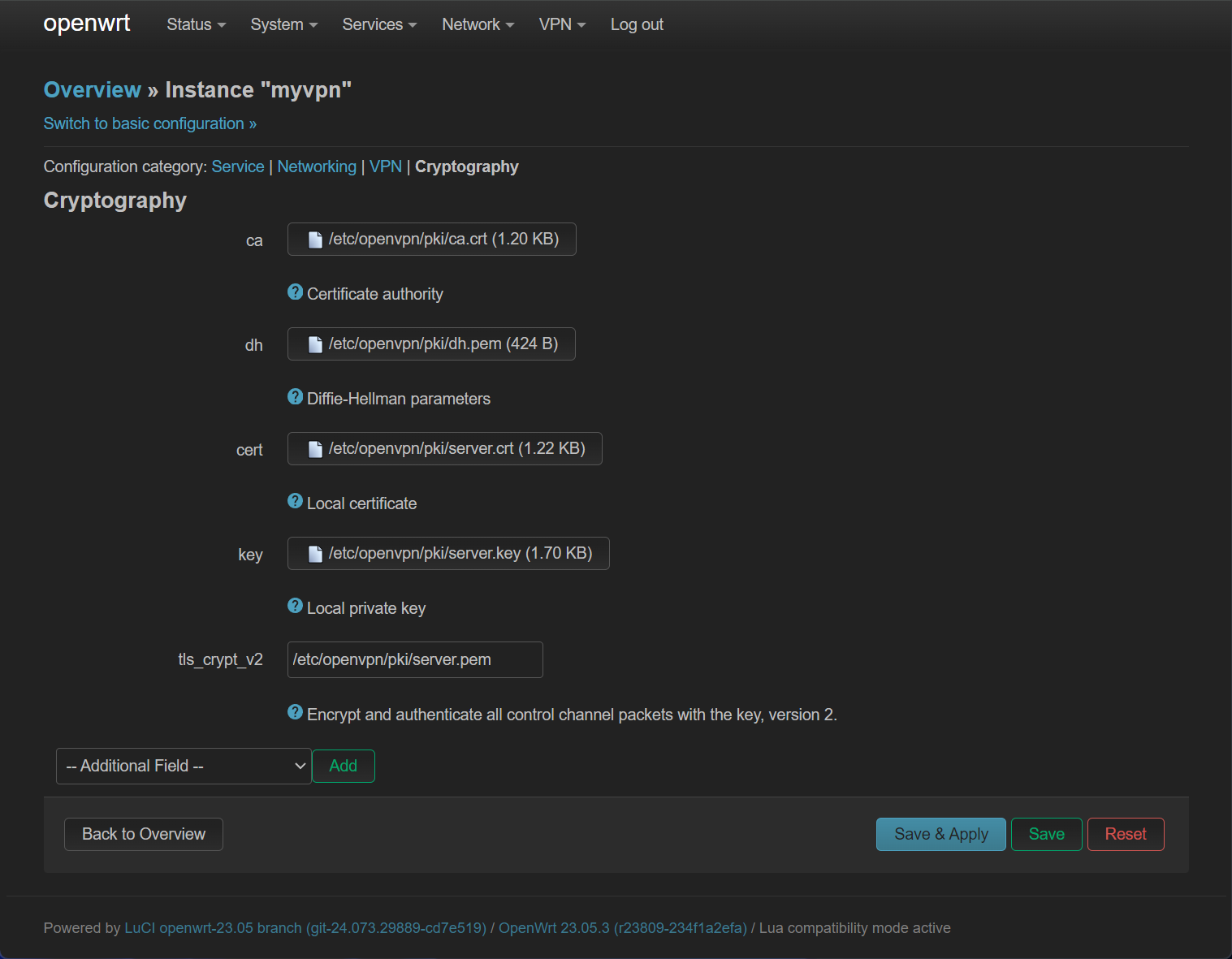 如果要使用图形化管理 OpenVPN ,首先需要安装 luci-app-openvpn ,之后根据 /etc/openvpn/server.conf 进行配置文件迁移。首先先在 /etc/openvpn/server.conf 中提取证书,并存放到相应位置:
