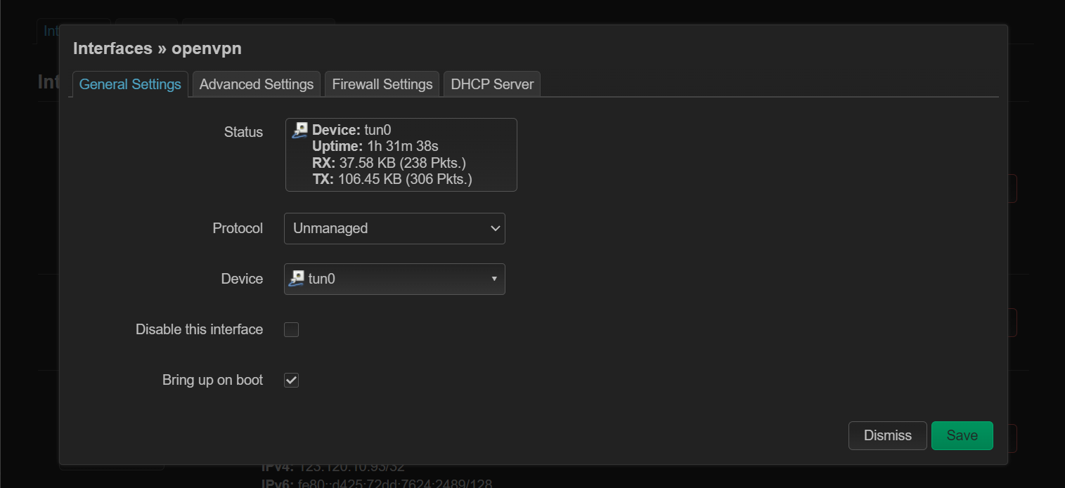 在 Network -> Interfaces 中添加 tun0 网络接口: