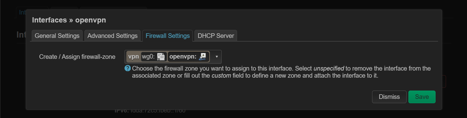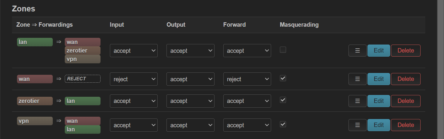 同时,在 Network -> Firewall -> Zones 中,设置 vpn 区域对所有区域可转发,开启 Masquerading ,Input 、 Output 、 Forward 全部 Accept :