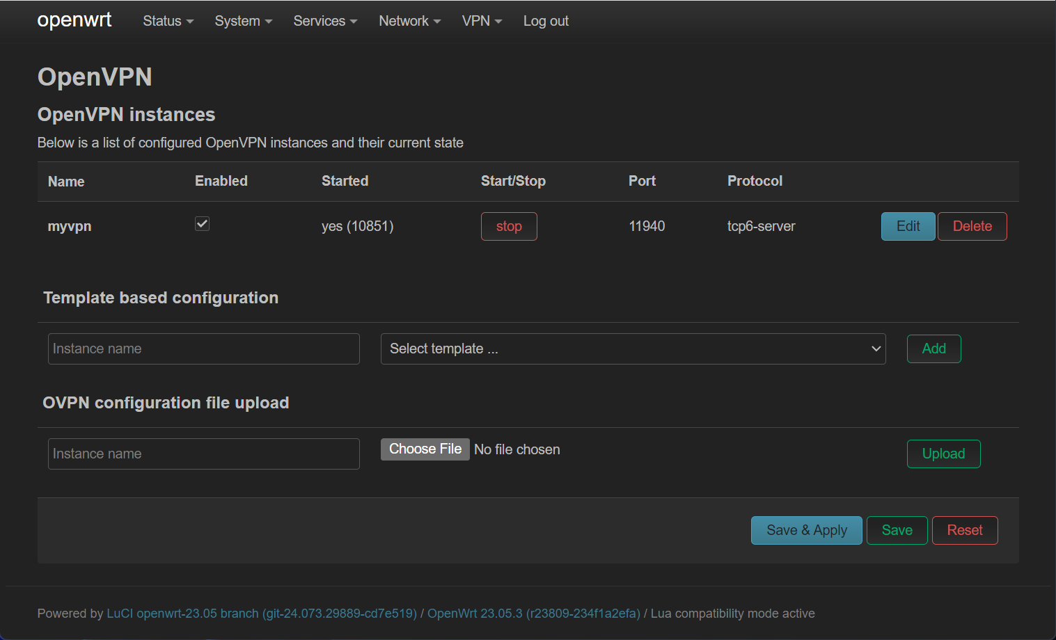 之后将 /etc/openvpn/server.conf 重命名为 server.conf.bak ,开始在 VPN -> OpenVPN 界面点击 Edit 对默认的 myvpn 进行配置: