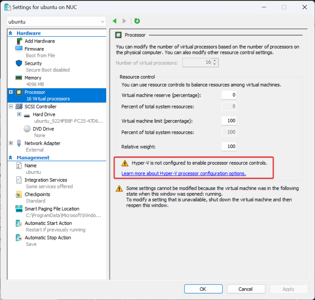 Hyper-V Hyper-V 修改调度器¶ 在尝试给 Hyper-V 虚拟机设置 CPU 使用限制时,发现这样的告警: 需要修改调度器。查看当前调度器的 PowerShell 命令为: 1Get-WinEvent -FilterHashTable @{ProviderName="Microsoft-Windows-Hyper-V-Hypervisor"; ID=2} -MaxEvents 1 命令返回如下: 1 2 3 4 5 6 ProviderName: Microsoft-Windows-Hyper-V-Hypervisor TimeCreated Id LevelDisplayName Message ----------- -- ---------------- ------- 6/1/2024 9:31:43 PM 2 Information Hypervisor scheduler type is 0x4. 其中 0x4 表示调度器为 Root scheduler ,其它数字含义如下: 1 = Classic scheduler, SMT disabled 2 = Classic scheduler 3 = Core scheduler 4 = Root scheduler 调度器具体区别可参考 Manage Hyper-V hypervisor scheduler types , 修改调度器方法为 Core scheduler 的方法为: 1bcdedit /set hypervisorschedulertype core 修改以后需要重启。