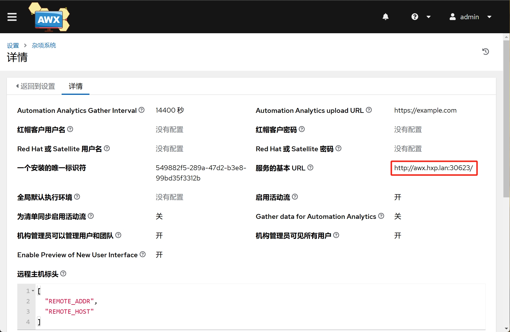 点击 设置 -> 杂项系统 ,修改 服务的基本 URL 为 AWX 的公网 URL: