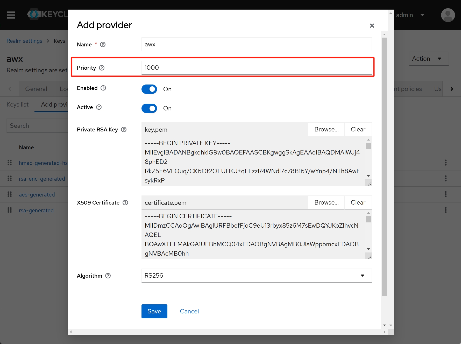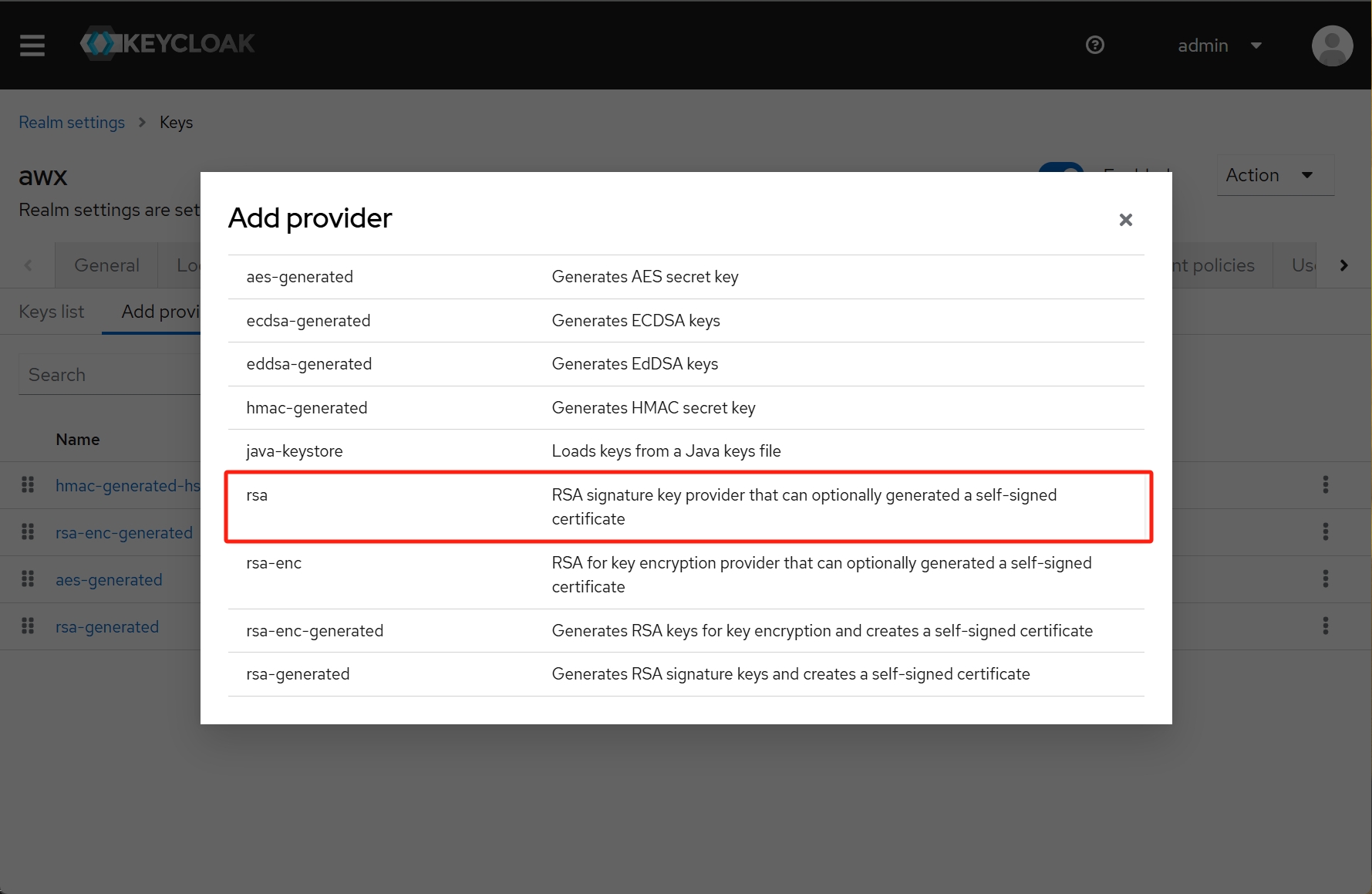 自签的 SSL 证书需要导入到 Keycloak ,点击 Realm Settings -> Keys -> Add provider 添加类型为 rsa 的密钥: