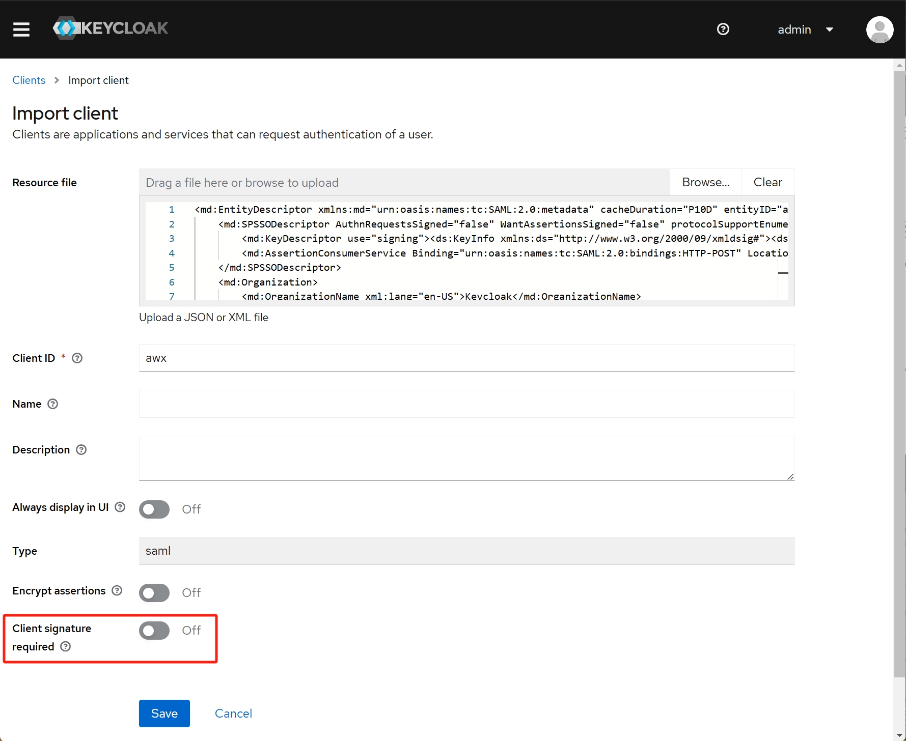 在 AWX 上完成 SAML 配置后,配置页面上 SAML 服务提供商元数据 URL 可下载 SAML 配置,下载此配置后,在 Keycloak 上新建 Realm 名称 awx ,点击 Clients -> Import client 将此配置导入: