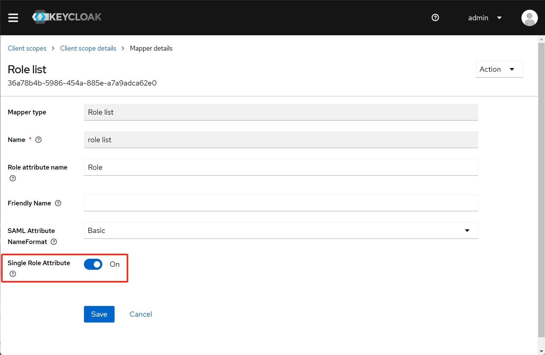 进入 Client scopes -> role_list -> Mappers -> role list ,开启 Single Role Attribute 选项: